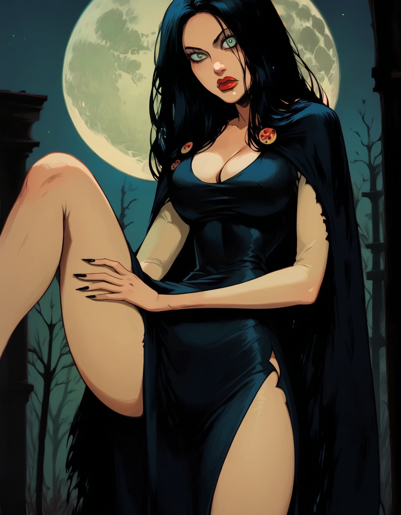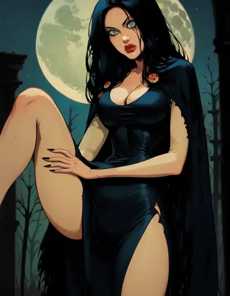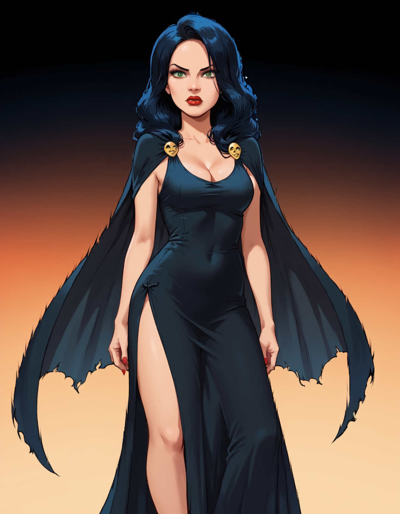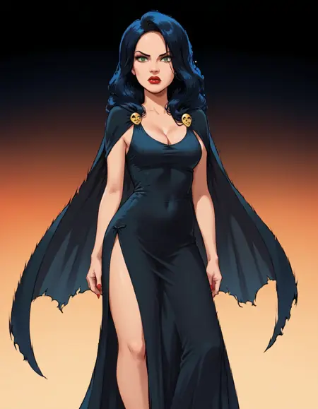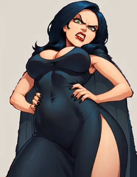 V1:Trigger words: scyllawaifuil, black hair, red lips, green eyes, makeup, eyeshadow, breasts, dress, strap dress, side slit, cleavage, black nails, black dress, high heels, lipstick, black hair