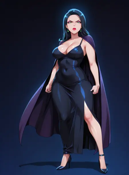 V1:Trigger words: scyllawaifuil, black hair, red lips, green eyes, makeup, eyeshadow, breasts, dress, strap dress, side slit, cleavage, black nails, black dress, high heels, lipstick, black hair