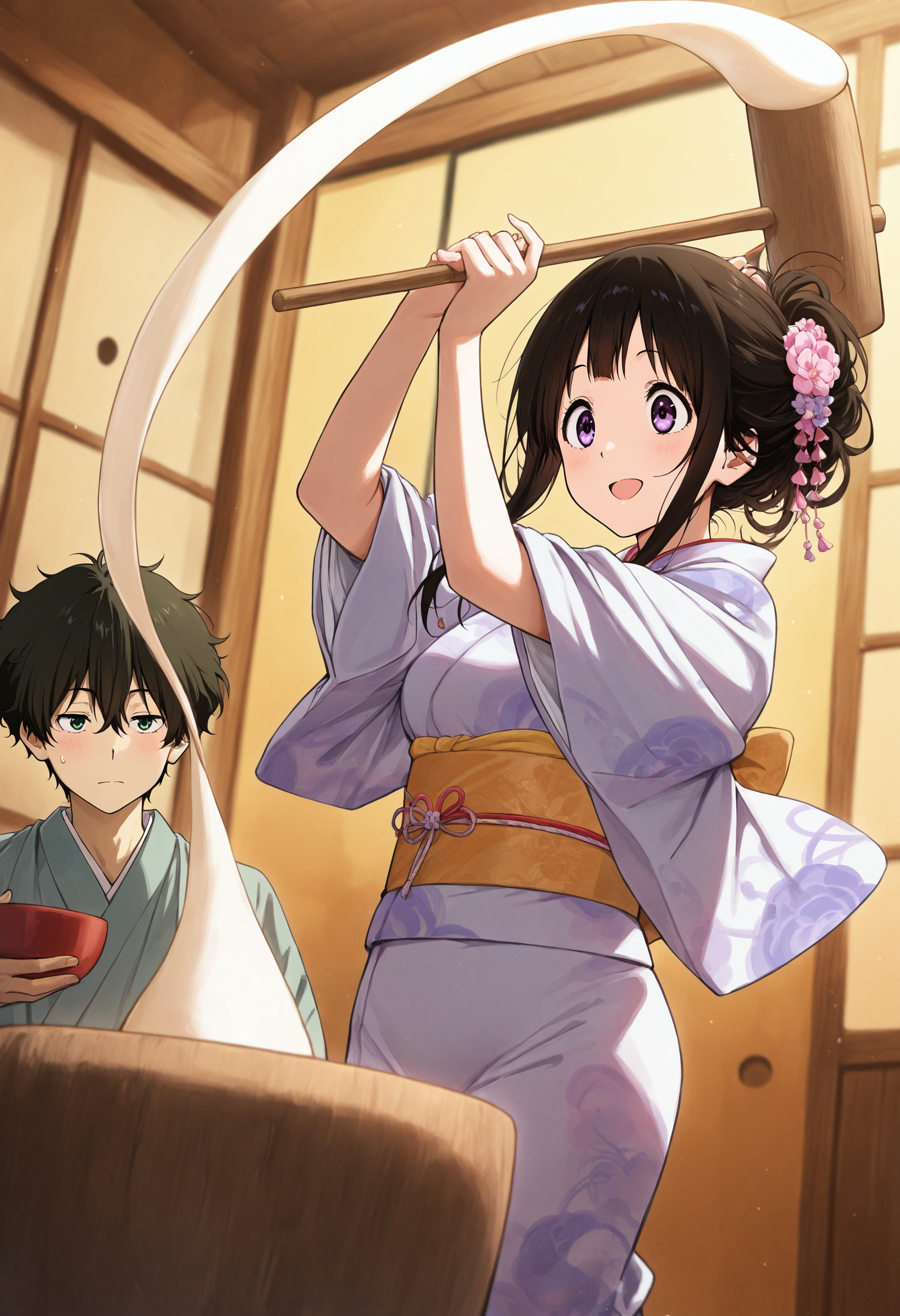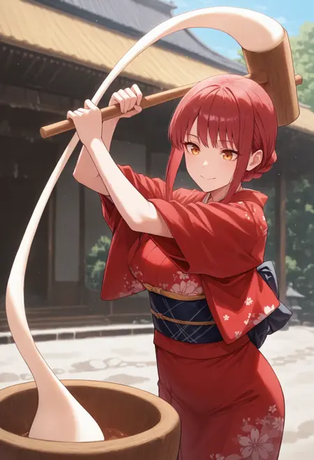 트리거: mochitsuki, mochi trail, mochi, holding kine, mallet, mortar \(bowl\)