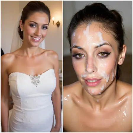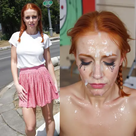 Two images before and after bukkake of a woman, [clothes], in first image she is [standing/ sitting] in a [place/background], in second image she is [pose] drenched in cum, cum on face cum all over body