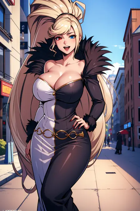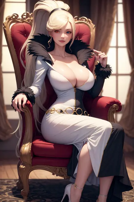 为展现她的典型形象,请添加 "发带、长马尾、长裙、毛皮镶边、高跟鞋"。