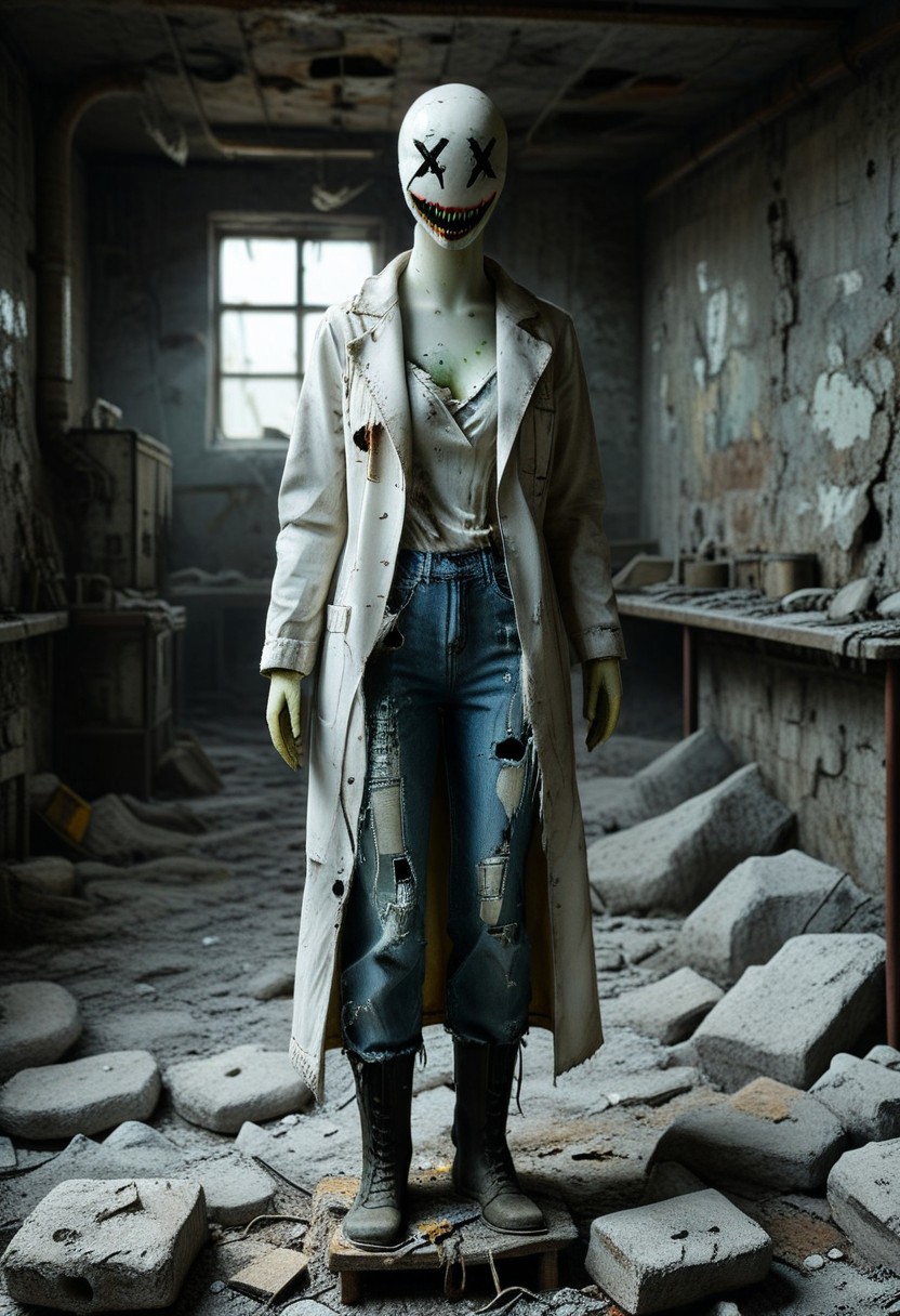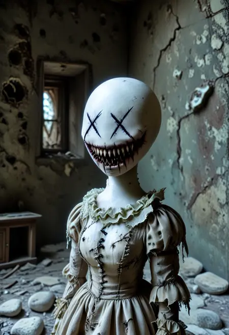 一个光头XXDFace白色无脸女性人偶,具有醒目的交叉缝合X形眼睛和厚重夸张的缝合獠牙笑容……