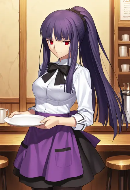 女服务员:a_fujino, 1girl, 复古艺术风格, 长发, 马尾, 紫发, 姬发式, 发圈, 红眼, 空洞眼神, Fujino女服务员, 白色衬衫, 黑色蝴蝶结, Fujino紫色高腰围裙, 黑色短裙, 黑色连裤袜, 长袖, 黑色领结, 中等胸部,