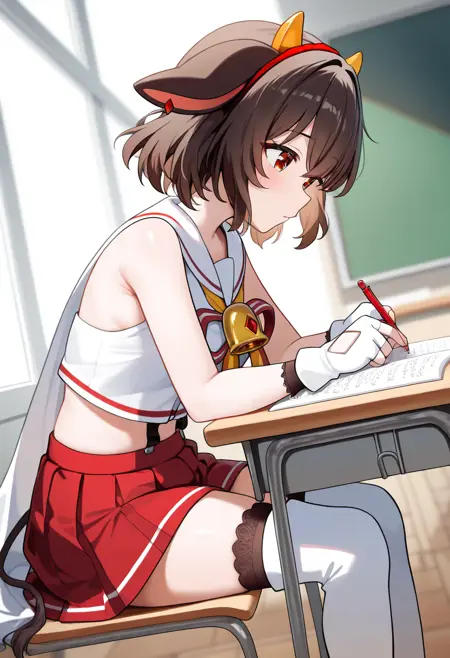 白いセーラー collar、ケープ、サスペンダー、クロップトップ、プリーツスカート、赤いスカート、フィートハイ、フィンガーレスグローブ、リボン、太ももブーツ、