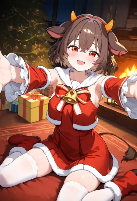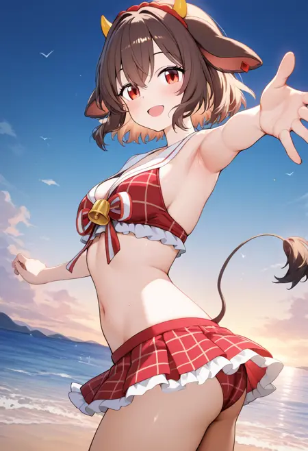赤い目、短い髪、角、牛の耳、牛の尾、茶色の髪、ヘアバンド、