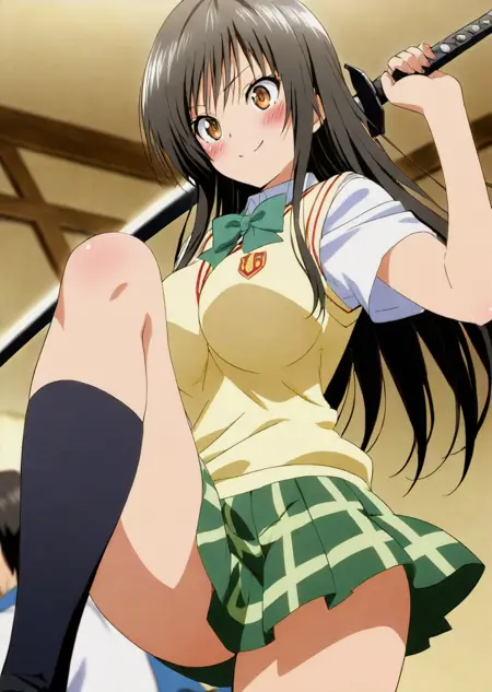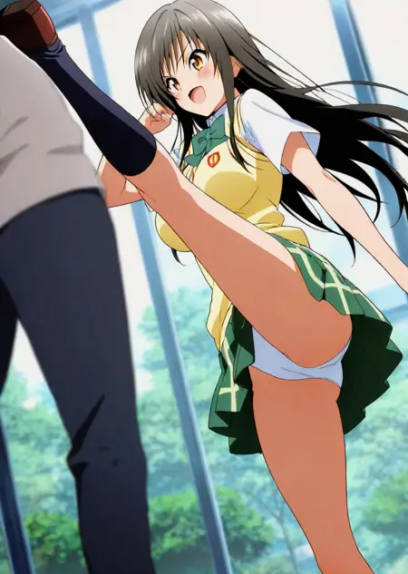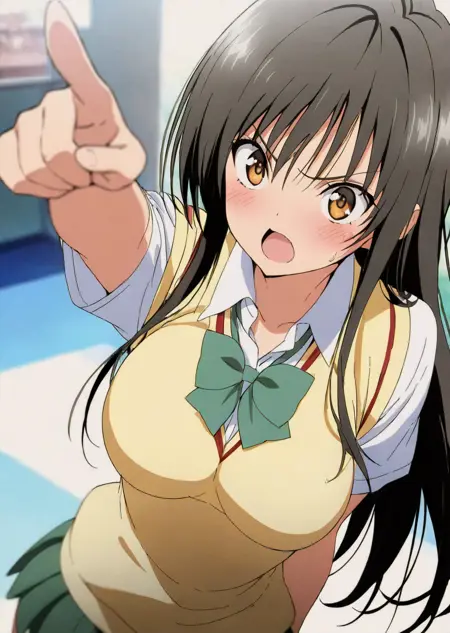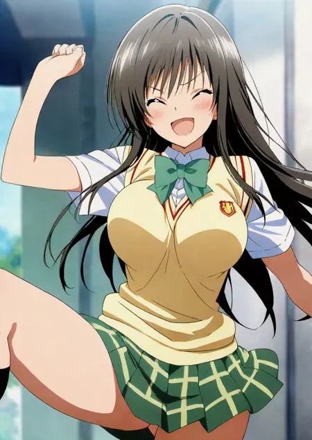 yui_kotegawa,black hair,long hair,hair between eyes,brown eyes,medium breasts,bangs,sidelocks,school uniform,sweater vest,collared shirt,pleated skirt,yellow vest,white shirt,green bowtie,short sleeves,miniskirt,green skirt,