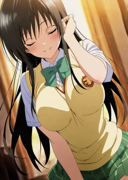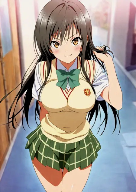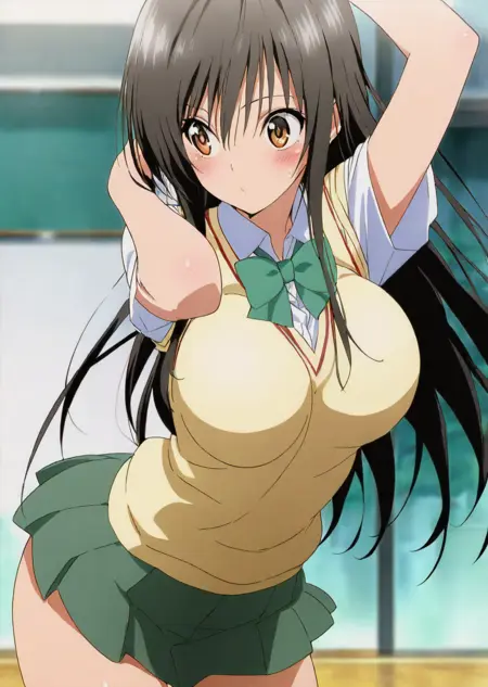 yui_kotegawa,black hair,long hair,hair between eyes,brown eyes,medium breasts,bangs,sidelocks,school uniform,sweater vest,collared shirt,pleated skirt,yellow vest,white shirt,green bowtie,short sleeves,miniskirt,green skirt,