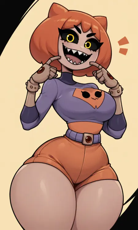 short hair, black sclera, sharp teeth, yellow eyes, purple bodysuit, orange hair