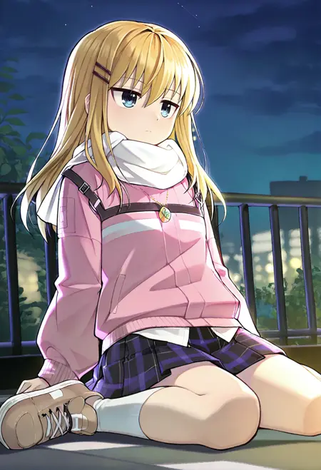 lucy-default,blue eyes,blonde hair,long hair,hairclip,pink sweater,untucked shirt,chest harness,white scarf,necklace, pleated skirt,plaid skirt,white socks,brown footwear,sneakers