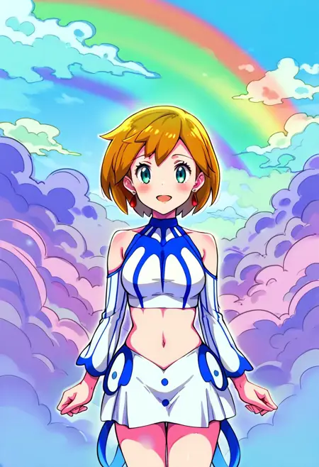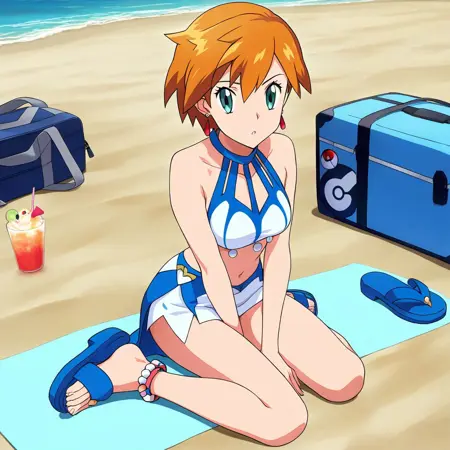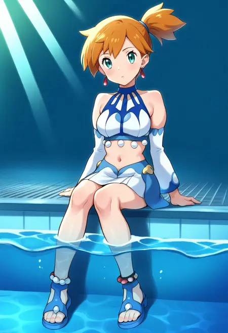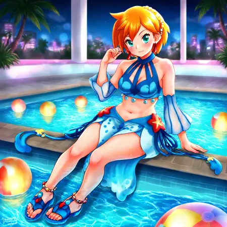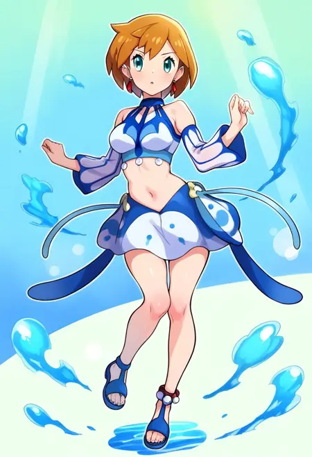 hair ornament, earrings, halterneck, crop top, detached sleeves, bare shoulders, collarbone, midriff, navel, skirt, anklet, sandals, toes, blue footwear