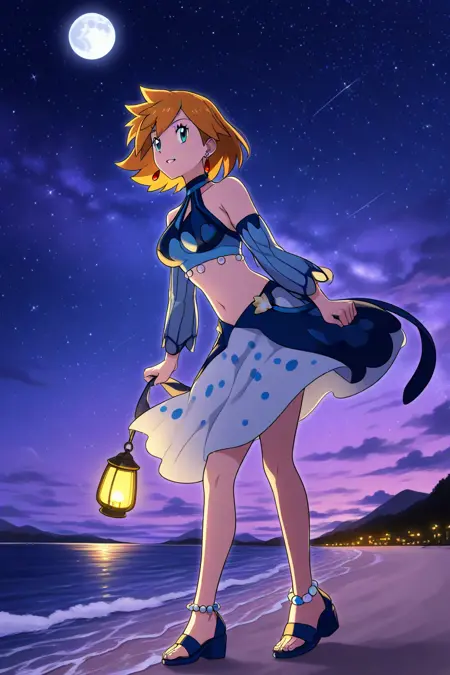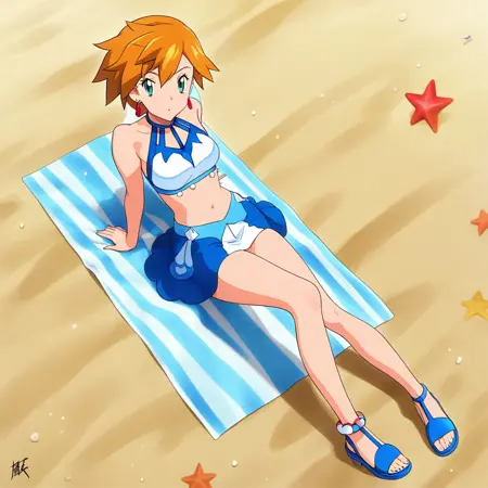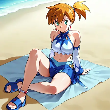 sygmisty, misty_\(pokemon\), blue_eyes, orange_hair, short_hair, skirt, long_skirt, knees, navel, deatached_sleeves, long_sleeves, bare_shoulders, jewerly, earrings, anklet, sandals, blue_footwear, toes, official_alternate_costume,