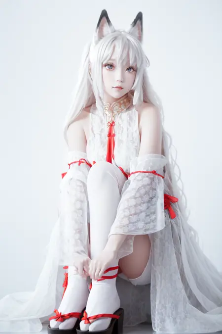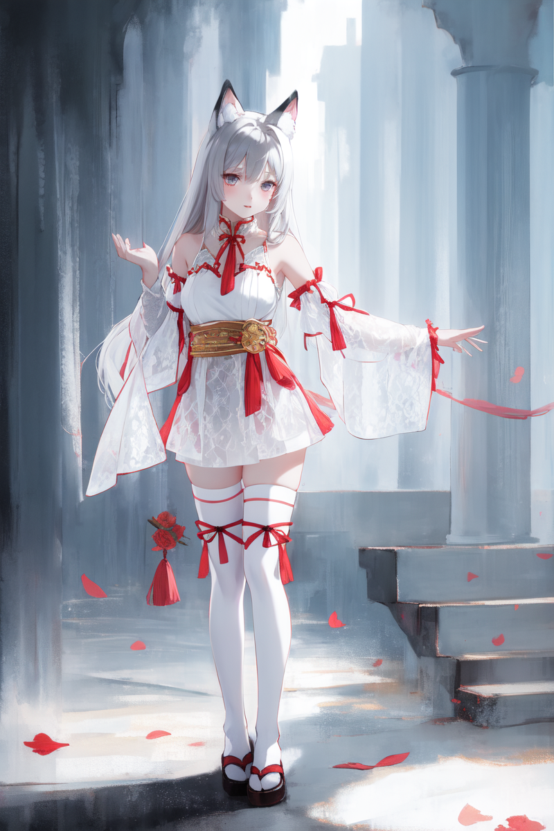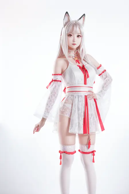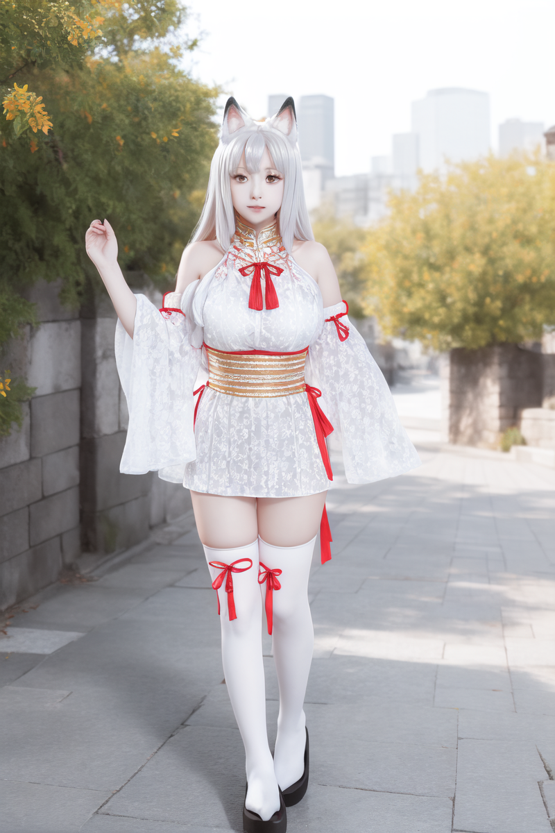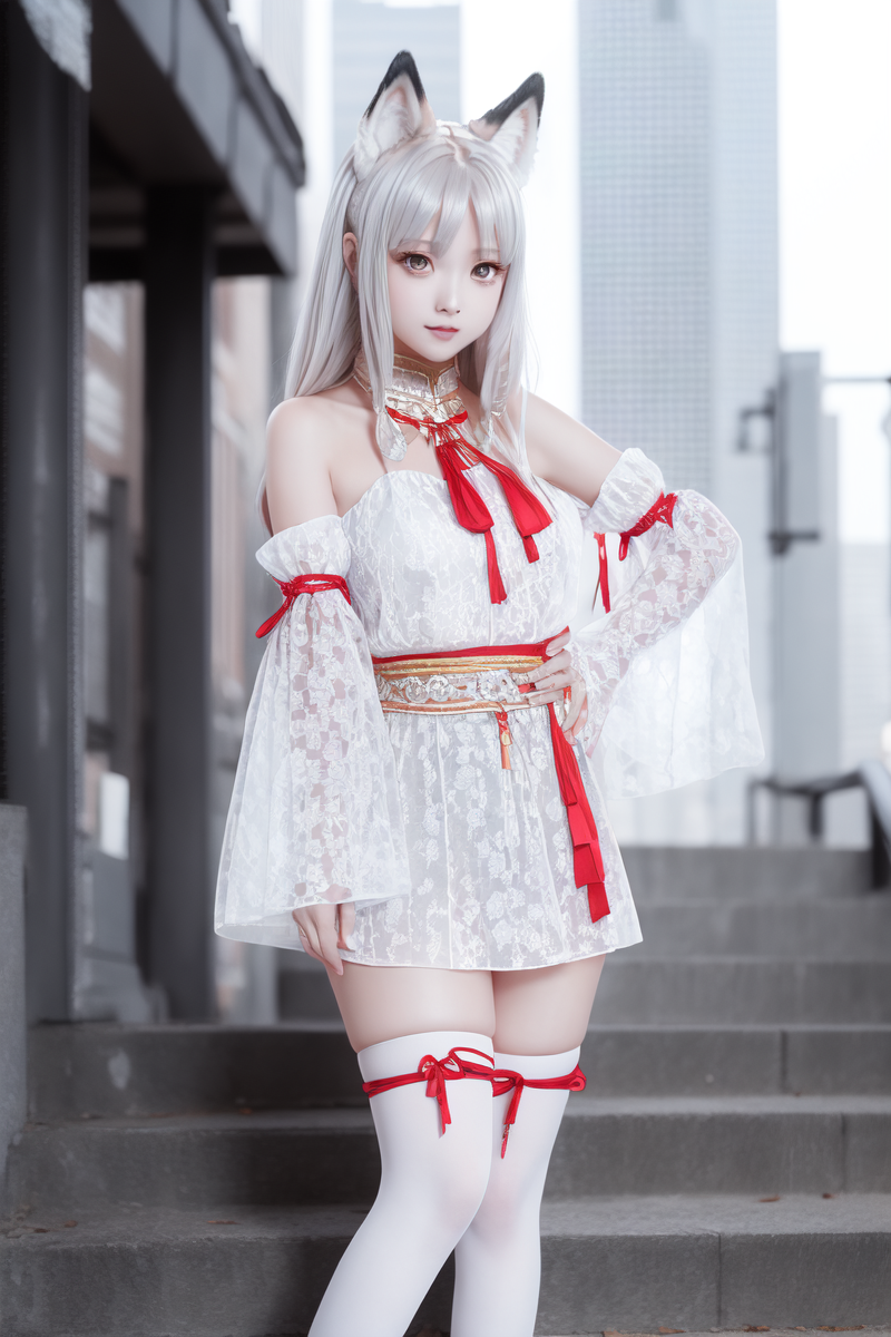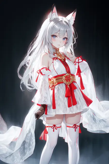 1girl,hutao,silver,white thighhighs,animal ears, detached sleeves,