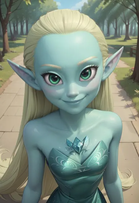 Trigger words: 1girl, Solo, Sylph_HI, light turquoise skin, green eyes, light blonde hair, light blonde eyebrows, long straight hair, pointy ears, blue triangle crystal on chest, strapless metallic teal dress, barefoot