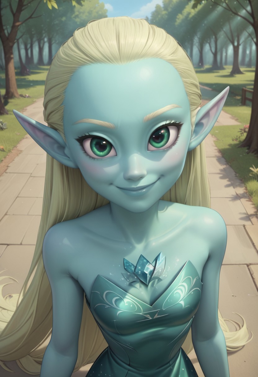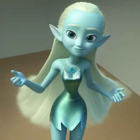 触发词:1girl, Solo, Sylph_HI, 浅蓝绿色皮肤,绿色眼睛,浅金色头发,浅金色眉毛,长直发,尖耳朵,胸前蓝色三角形水晶,无肩带金属青绿色连衣裙,赤脚