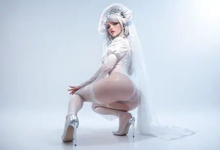 服装标签:深V领,过膝袜,首饰,耳环,项链,珍珠项链,项圈,白色项圈,面纱,(连衣裙,白色连衣裙),手套,毛皮镶边