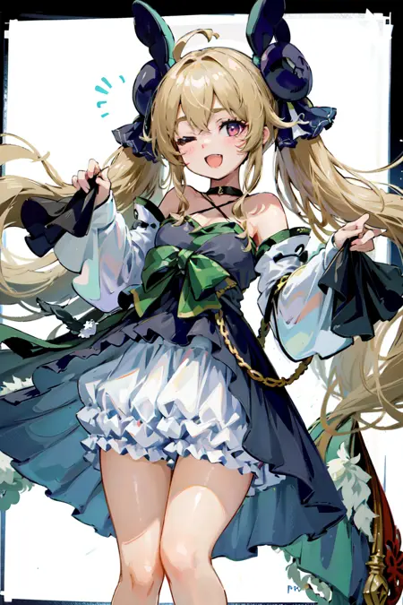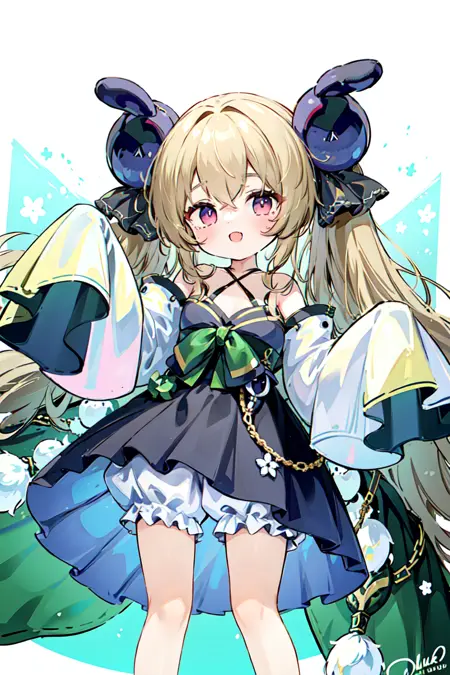 原版(origen):attilio_regolo\(azur_lane\),twintails,long_sleeves, sleeves_past_fingers, bloomers,dress, green_bow, hair ribbon,