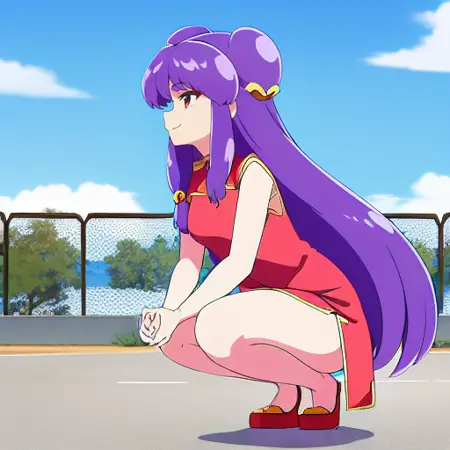 Shampoochan, redshdress, double bun, red eyes, purple hair,