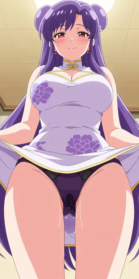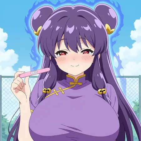 ShampooChan, purple hair, red eyes, long hair, long forelock, hair bun, double bun, hair bell, hair ornament, médium breasts,