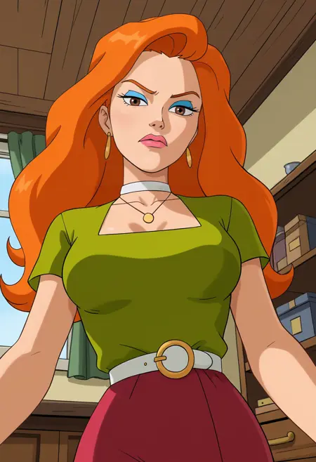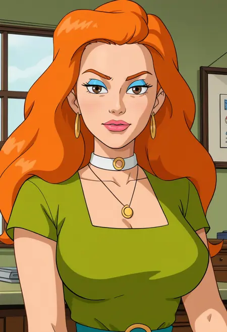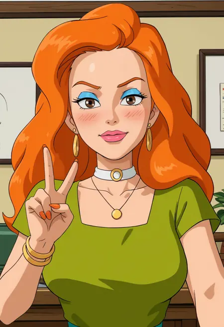 • cmel, 1girl, long hair, orange hair, breasts, brown eyes, lipstick, makeup, blue eyeshadow, jewelry, bracelet, necklace, skirt, choker, shirt, earrings