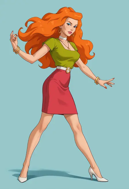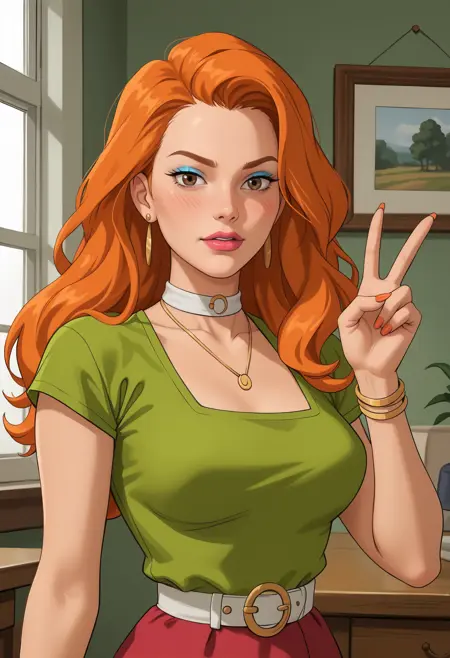 cmel, 1girl, long hair, orange hair, breasts, brown eyes, lipstick, makeup, blue eyeshadow, jewelry, bracelet, necklace, skirt, choker, shirt, earrings