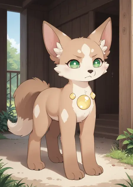 inukoyu, dog, brown two-tone fur, yellow details, green eyes, fox tail