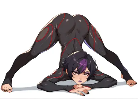 1girl, solo, short hair, streaked hair, black hair, purple hair, brown eyes, eyeshadow, lipstick