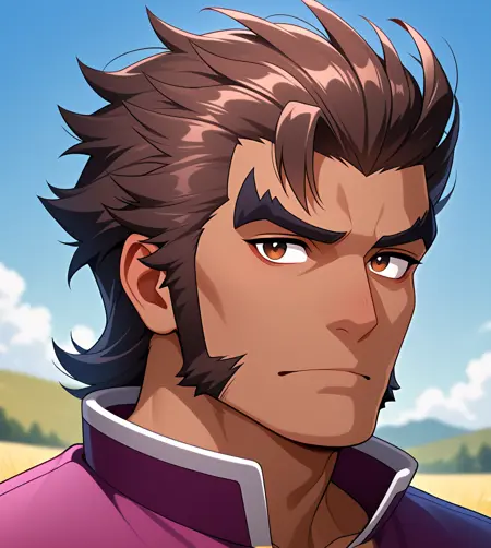 デフォルトの衣装: valyx_dl, 茶色の髪, ひげ, 茶色の目, 茶色の肌の男性, 胸当て, 赤いシャツ, 肩当て, ガンレット, ベルト, 紫のズボン, 脚の防具,