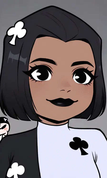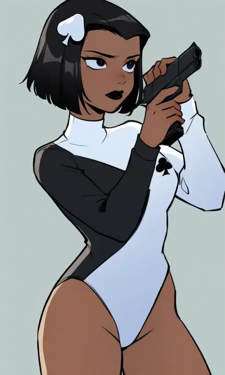 1girl, dark skin,black hair, Bob cut, short hair,black eyes,black lips,two-tone leotard, split-color leotard, white leotard, black leotard, asymmetrical clothes, long sleeves, hair ornament, club(shape),ace of clubs