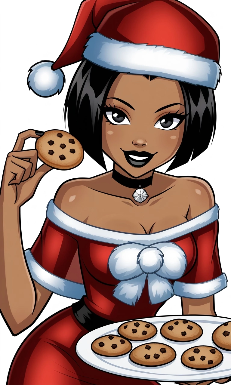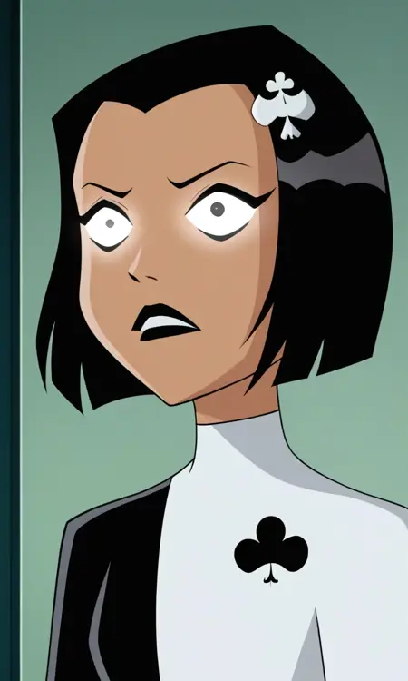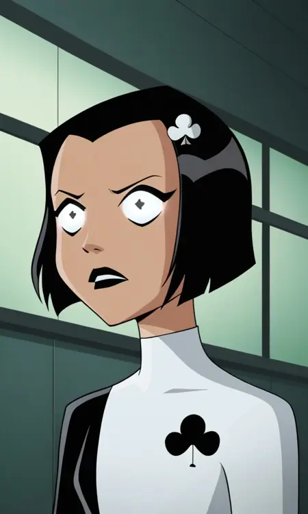 1girl, dark skin, tan skin, black hair, Bob cut, black eyes,black lips,two-tone leotard, white leotard, black leotard, asymmetrical clothes, long sleeves, hair ornament, club(shape)