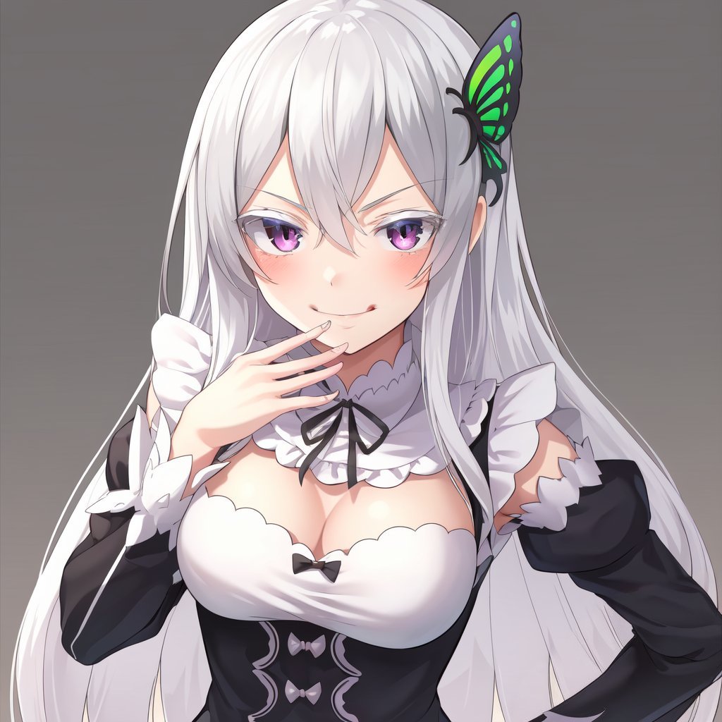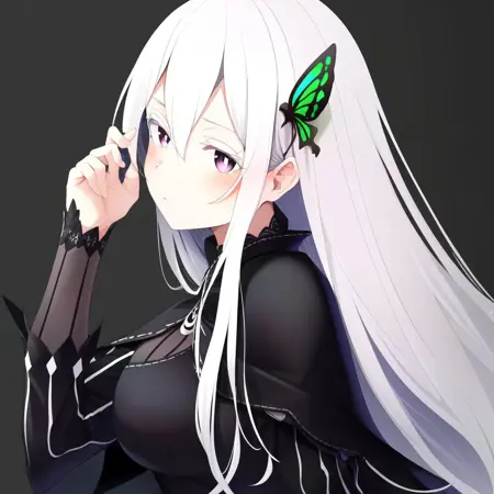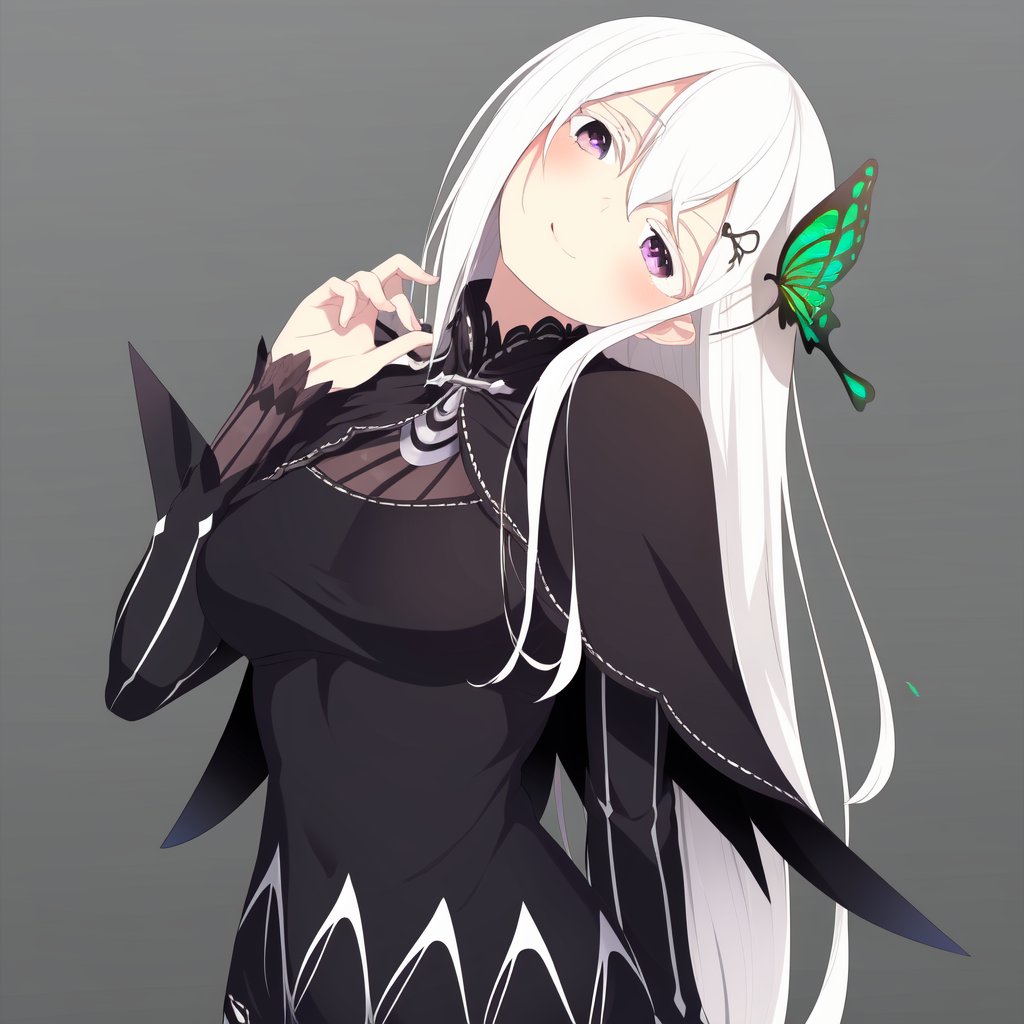 echidna, white hair, long hair, purple eyes, butterfly hair ornament, black dress, black capelet