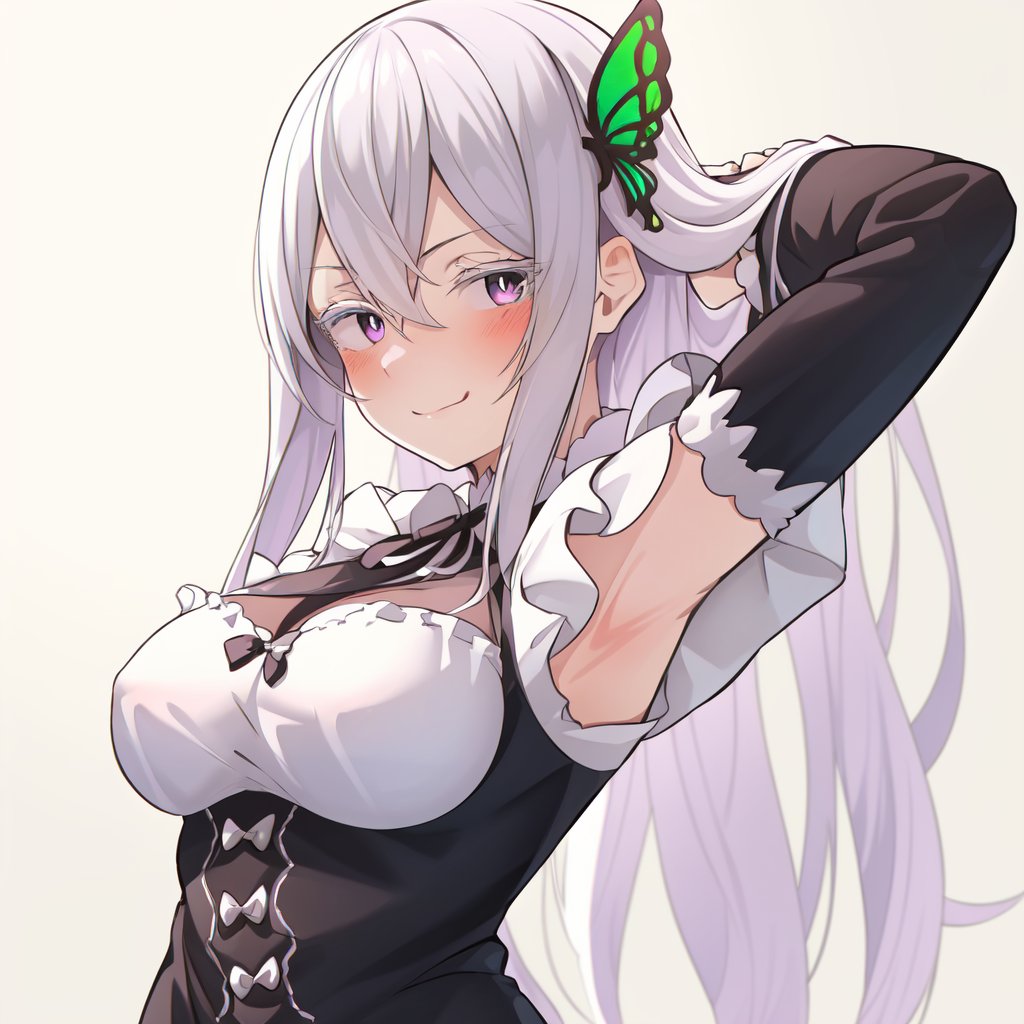 echidna, white hair, long hair, purple eyes, butterfly hair ornament, maid