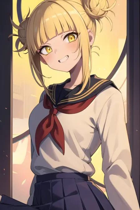 히미코 토가, 금발, 평범한 앞머리, 더블 둥글머리, 머리에 가려진 눈썹, 아이라인, 머리 둥글머리, 메이크업,乱된 머리, (노란 눈:1.5), 송곳니, 좁은 눈,