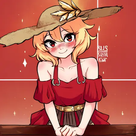Centurii: centuriic,金色头发,红色眼睛百夫长服装: 百夫长,红色羽饰,一只手套,盔甲,披风夏日礼服: summerdress,红色连衣裙,露肩,草帽