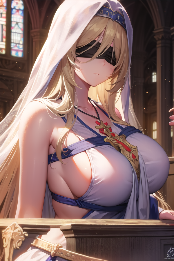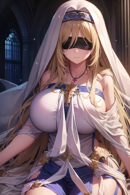 剣の乙女、長い髪、金髪、目隠し、(黒い目隠し:1.2)、(大きな胸:1.2)