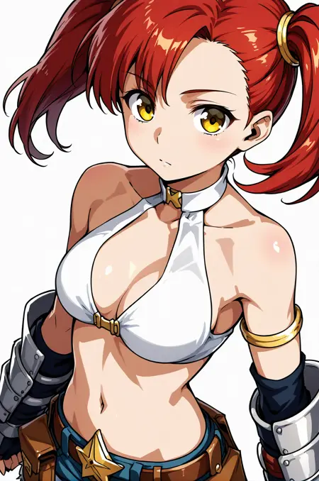 提示词:msRO,牛仔短裤,露脐,无指手套,肘部手套,腰带,肚脐,护臂,露肩颈,臂环,长筒靴