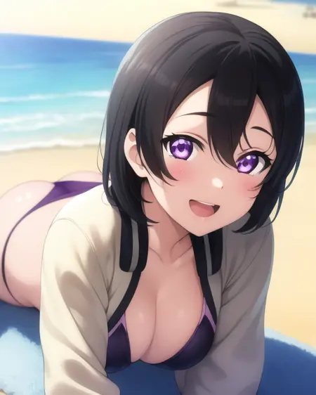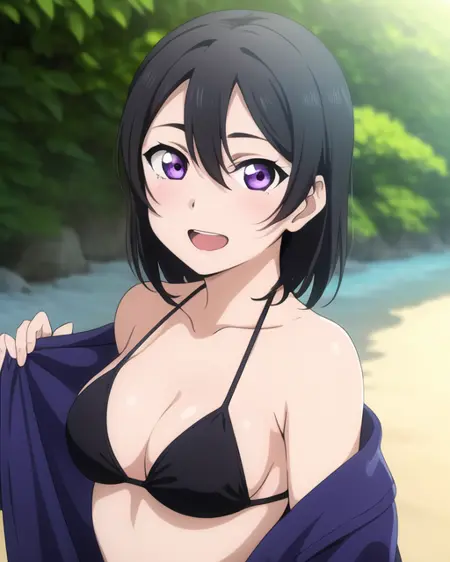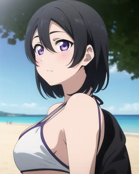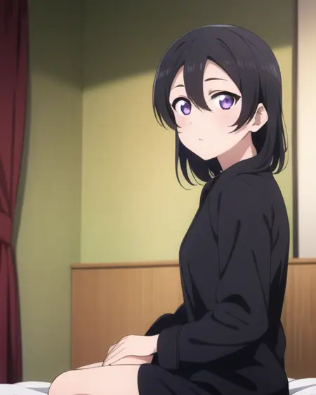 추가 태그(권장): purple eyes, medium hair, black hair, bangs, hair between eyes