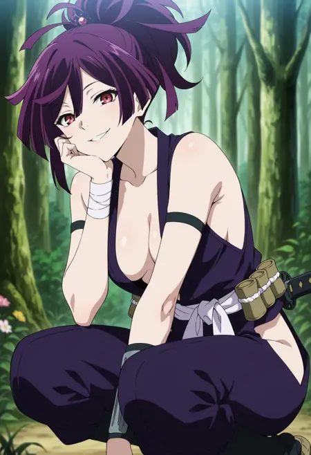 基础:yuzuriha_j, 1girl, 动画上色, 复古艺术风格, 单人, 短发, 马尾, 发髻, 发簪, 紫色头发, 发丝遮眼, 紫色眼睛, yuzu 紫色无袖和服, 中开襟, 中等胸部, 白色腰带, 侧开衩, 黑色臂带, 单侧护腕, 绷带式手腕, 裸露肩膀, 短鞘太刀,