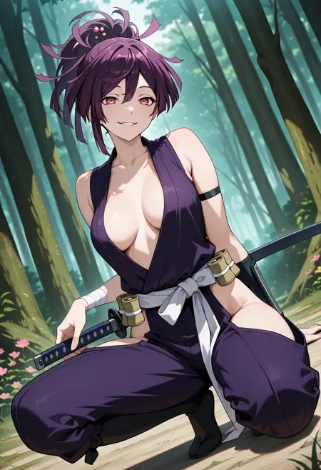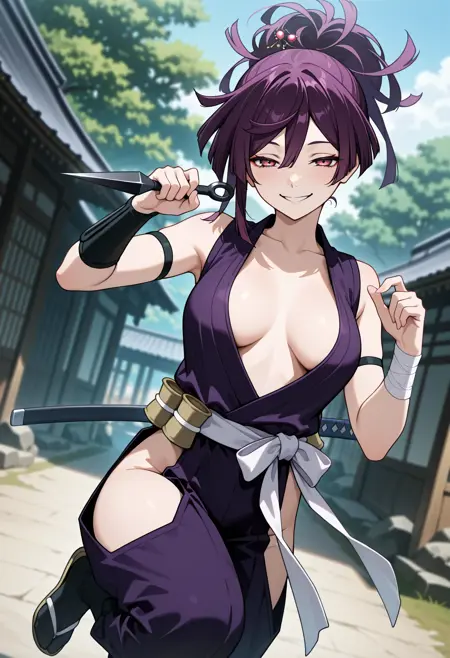 베이스: yuzuriha_j, 1girl, 애니메이션 컬러링, 리트로 아트스타일, 솔로, 단발, 팔찌머리, 높은 언덕 머리, 머리핀, 보라색 머리, 눈 사이의 머리카락, 보라색 눈, 유즈 보라색 어깨없는 기모노, 중앙 오픈, 중간 크기의 가슴, 흰색 띠, 허리 통, 검은 팔찌, 한쪽 손목 보호대, 붕대 손목, 드러난 어깨, 짧은 칼집에 찬 카타나,
