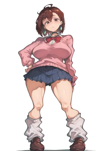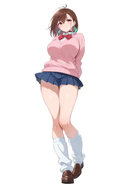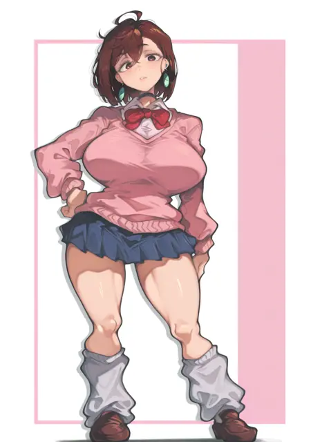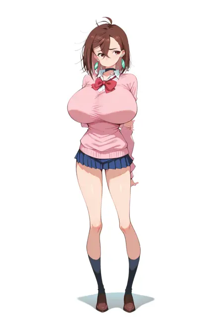 プロンプト: momo ayase、イヤリング、茶色の髪、ギャル、赤いリボン、学校制服、スカート、ピンクのセーター、