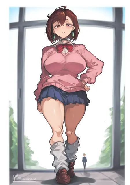 Prompts: momo ayase, earrings, brown hair, gyaru, red bow, school uniform, skirt, pink sweater,