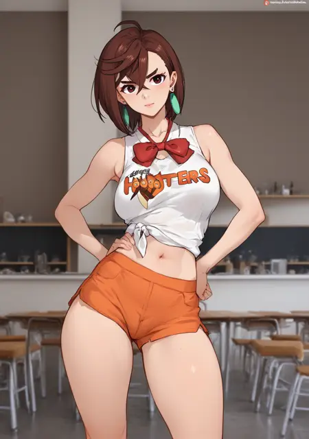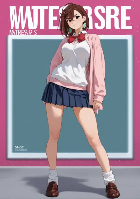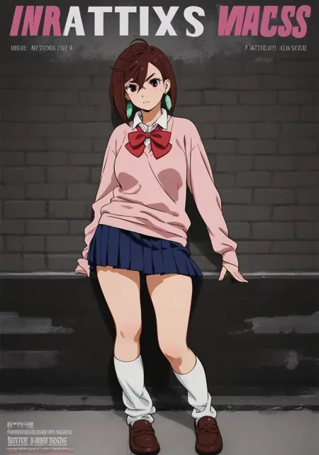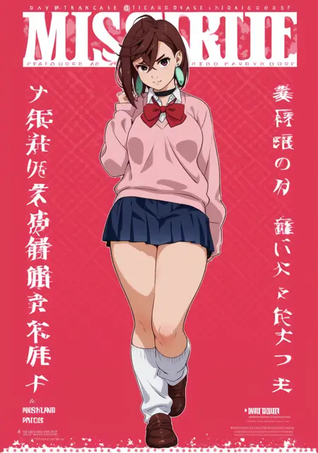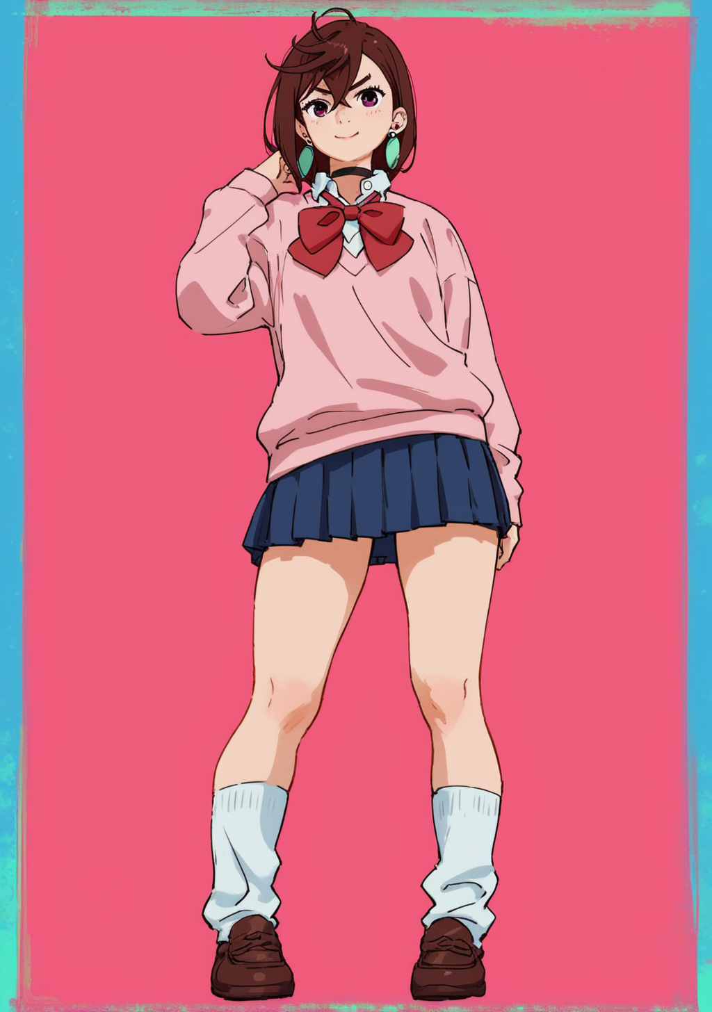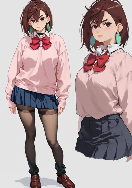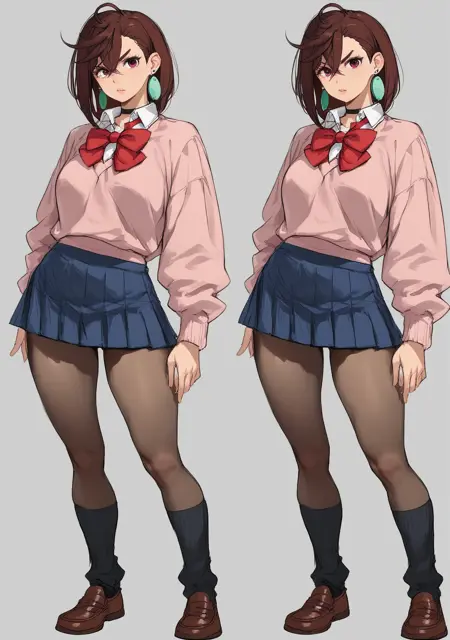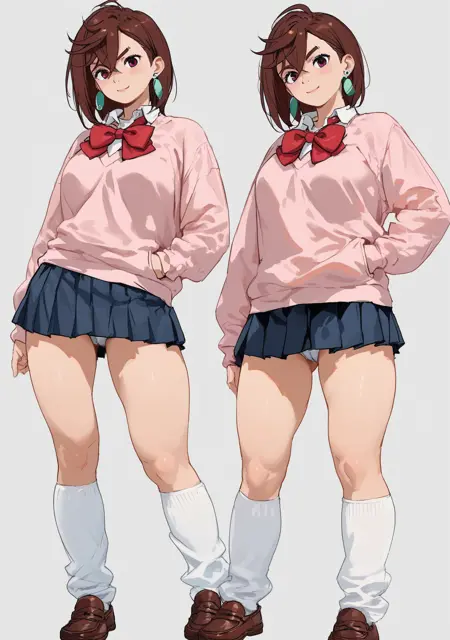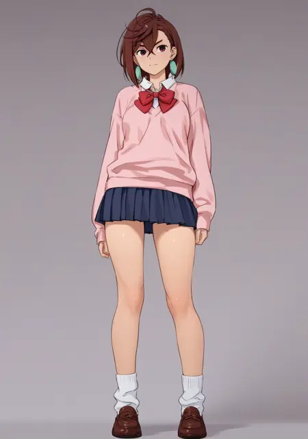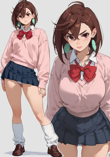 プロンプト: momo ayase、イヤリング、茶色の髪、ギャル、赤いリボン、学校制服、スカート、ピンクのセーター、