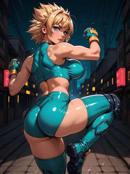 アウトフィット5:ターコイズのスパンデックストップ、ターコイズのスリーブレッグ、ターコイズのブーツ