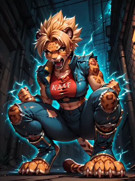 sh1n4half - 「半変身」した外観です。髪は残っており、顔はわずかに動物的です。服は体格の増加を示すようにきつく巻きついており、体にはチーターの斑紋、尾、爪のある足が現れます。