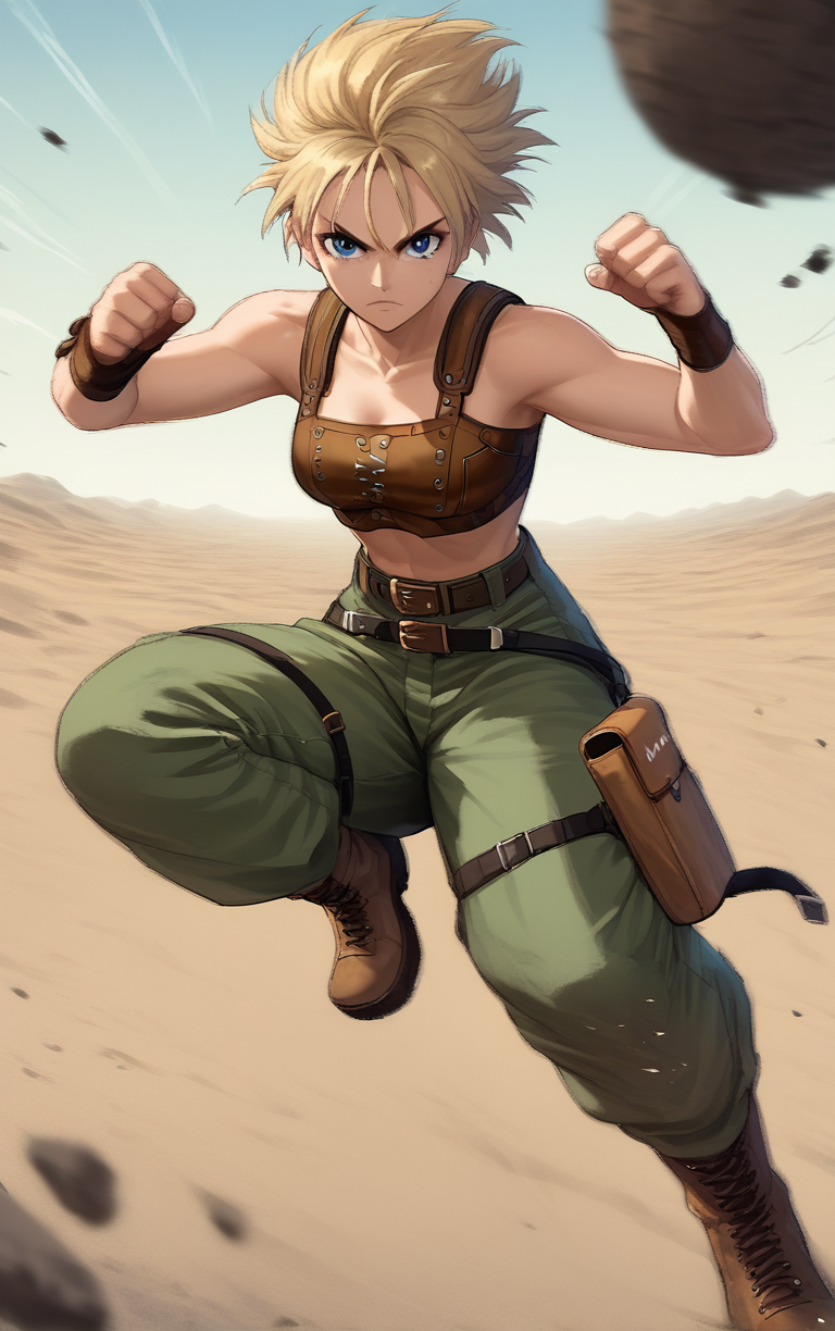 请不要在猎豹形态中提示“靴子”(她在此形态下是赤脚的),一般仅在全身镜头中提示靴子。你可以进行有限的混搭(例如,你可以不穿第一套服装的蓝色夹克,她只会穿衬衫)。红色衬衫上印有“KMF”字样(与游戏中相同)——但若发现字母难以显现,我建议使用“局部重绘”功能再次处理她的胸部区域。