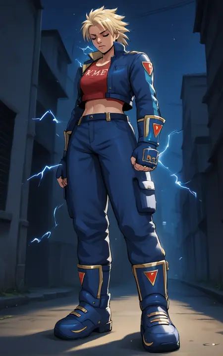 아웃핏 1: 파란색 재킷, 빨간 KMF 상의, 파란색 바지, 파란색 부츠, 손가락 없는 장갑, 파란색 팔찌, 파란색 정강이 보호대, 벨트, 허리 부분