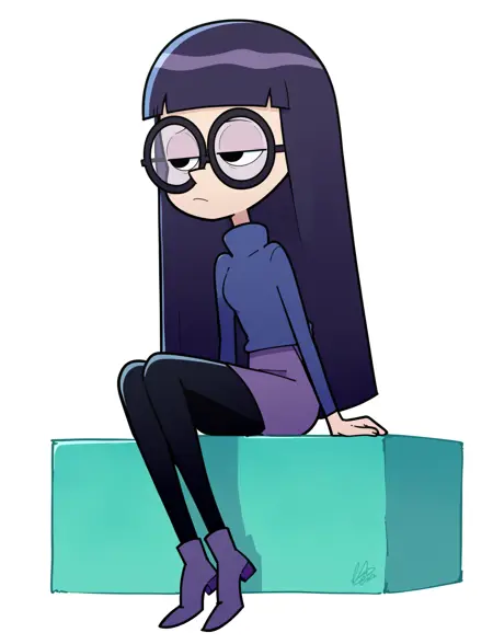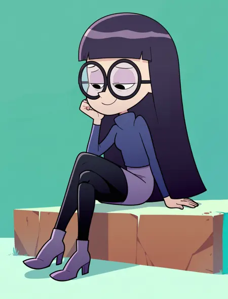 옷: 터틀넥 스웨터, 치마, 검은 팬티스타킹, 보라색 신발