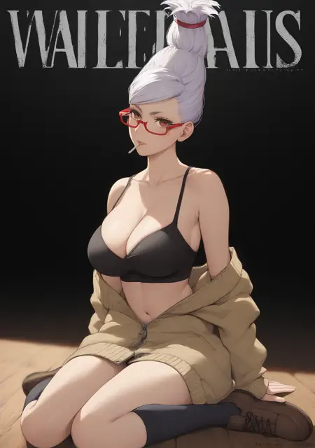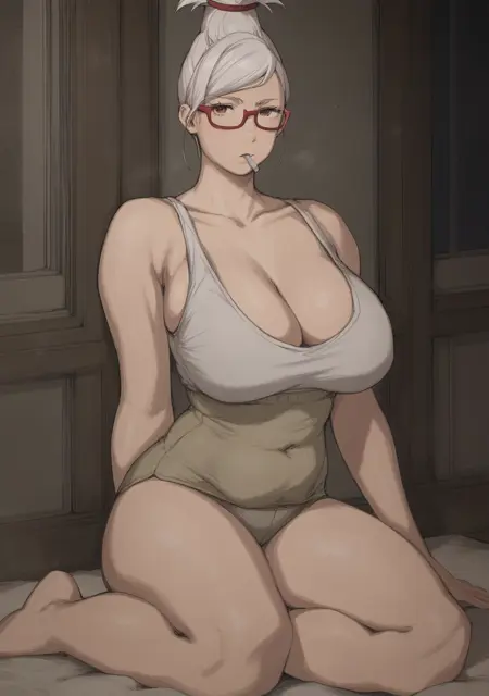 プロンプト: 葉月聖子、大きな胸、白髪、髪を上げた、赤い眼鏡、長い髪、