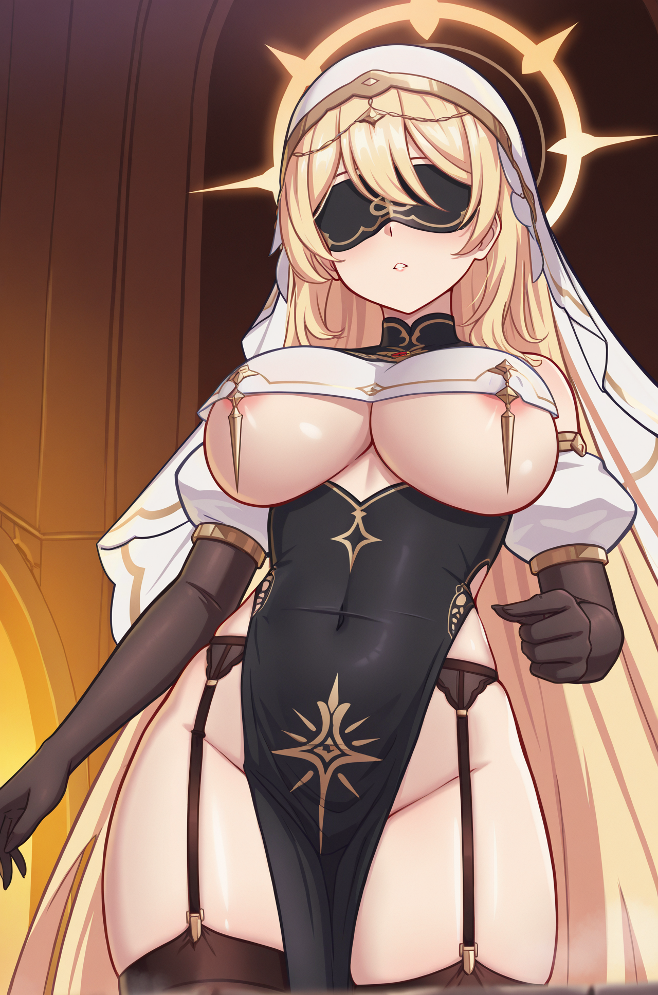 | トレーニングワード | astei_outerplane, 1girl, breasts, solo, blonde hair, long hair, thighhighs, halo, gloves, large breasts, underboob, very long hair, pelvic curtain, breast curtain, nun, elbow gloves, blindfold, garter straps, habit, black gloves, high heels, black thighhighs, garter belt, white veilコピーしました! |