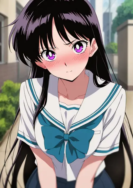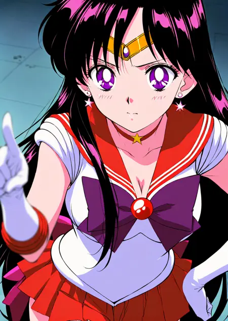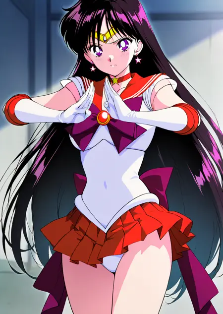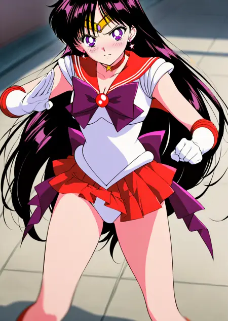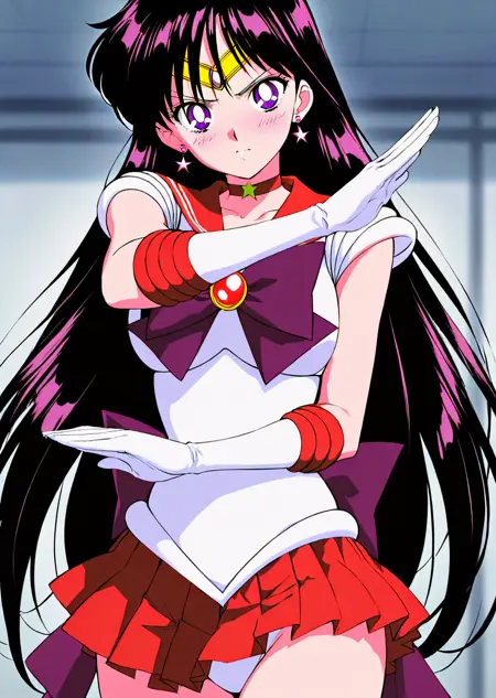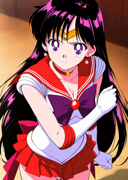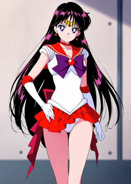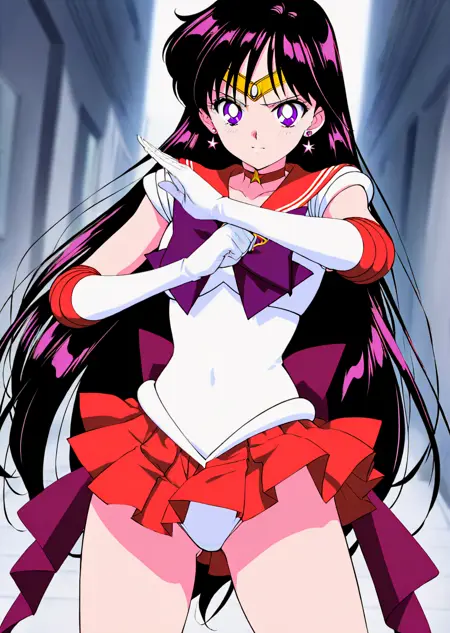 triggerWord: hino rei,solo,black hair,diadem,long hair,purple eyes,parted bangs,gloves,magical girl,microskirt,pleated skirt,red skirt,skirt,leotard,sailor senshi uniform,white gloves,bow,purple bow,sailor collar,red sailor collar,
