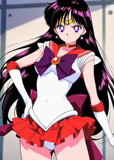 triggerWord: hino rei,solo,black hair,diadem,long hair,purple eyes,parted bangs,gloves,magical girl,microskirt,pleated skirt,red skirt,skirt,leotard,sailor senshi uniform,white gloves,bow,purple bow,sailor collar,red sailor collar,